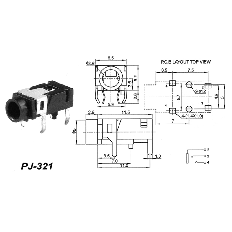 PJ-321 Audio Jack 4 pin jack 3.5mm Headphone Audio Jack black